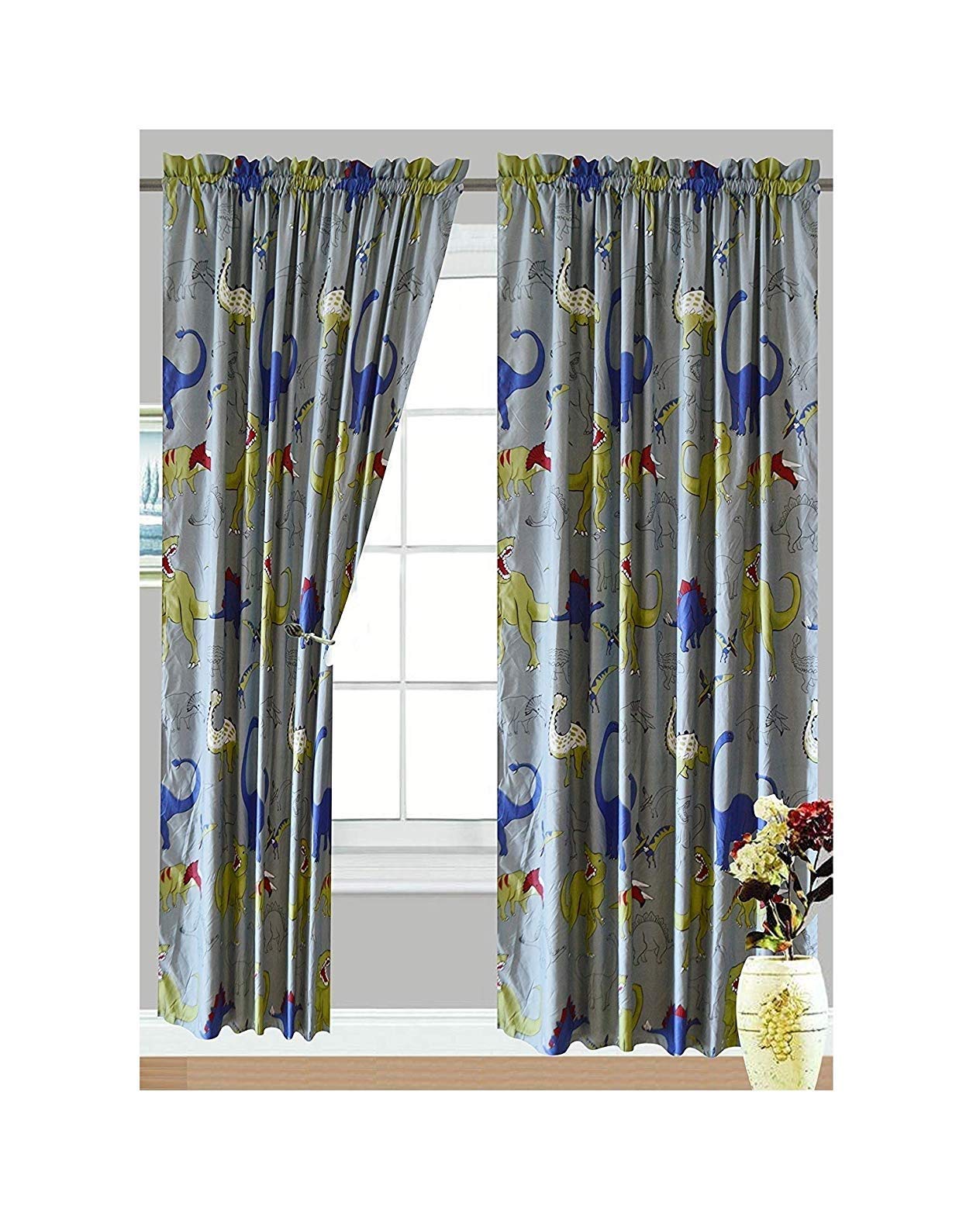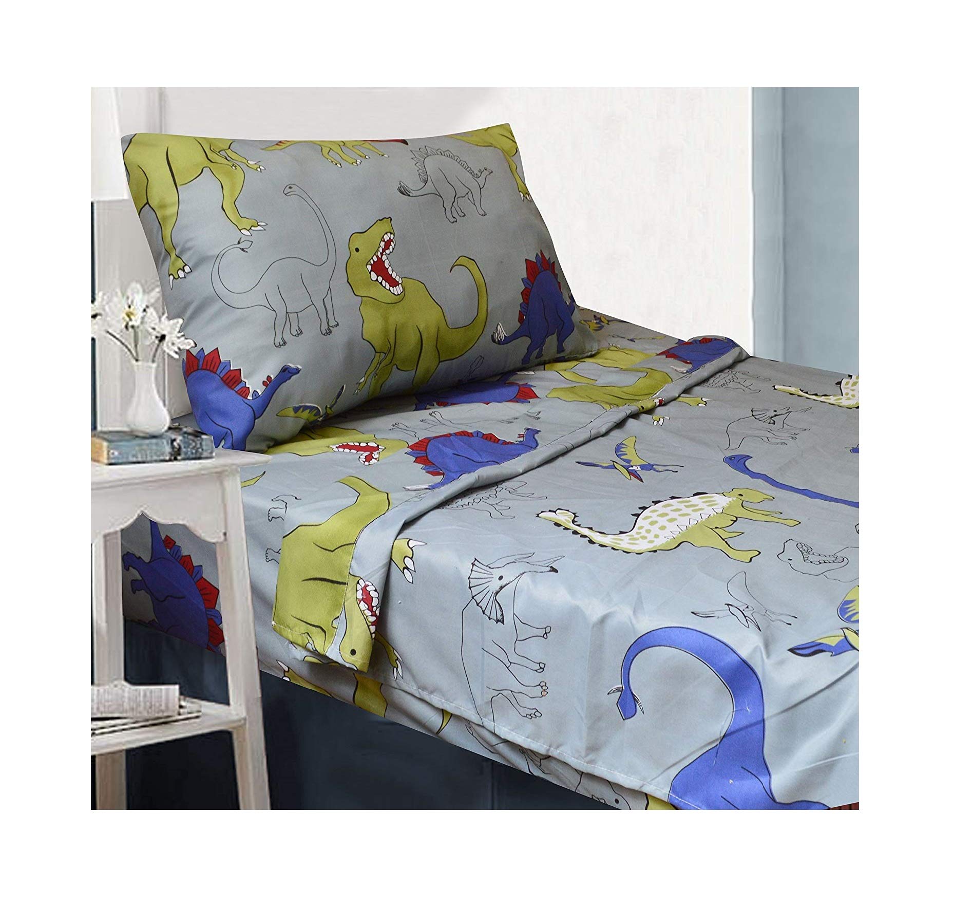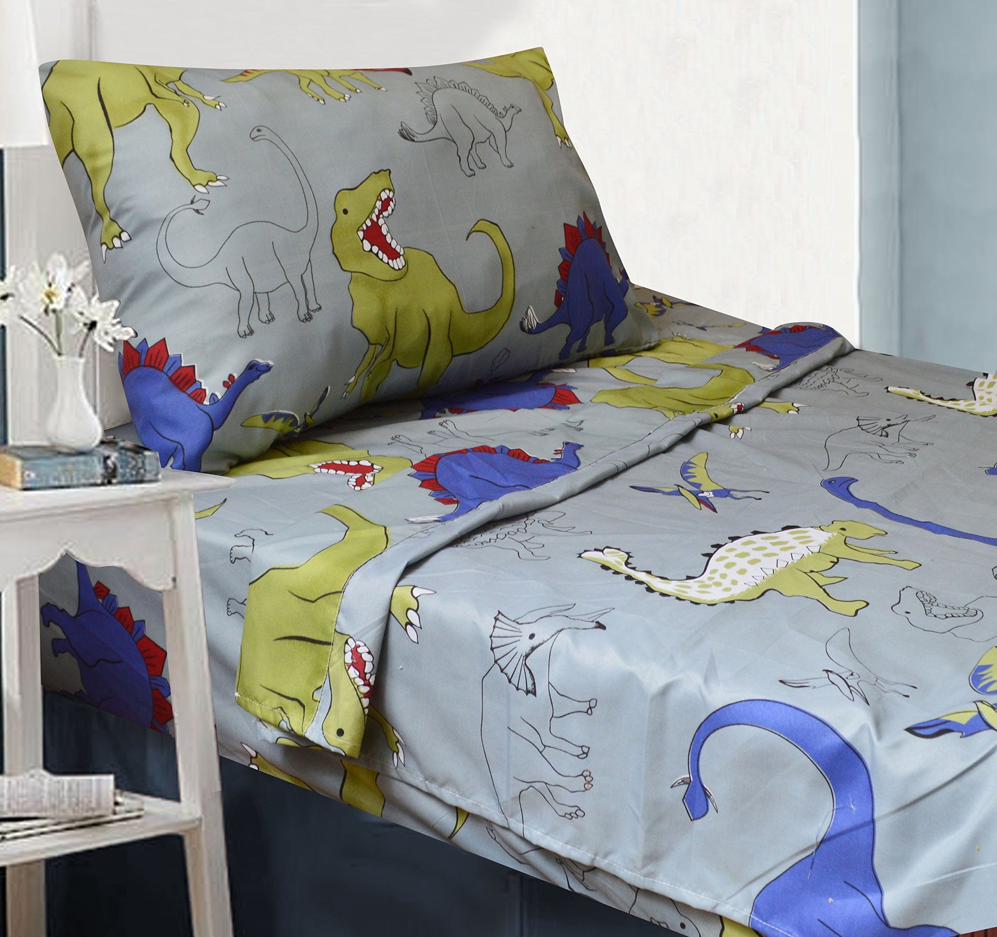 Details: Turn your child's bedroom into Dinosaur Central with this colorful comforter bed set. The comforter forms the centerpiece of the room with its design of popular dinosaurs on a gray background that blends easily into any setting. The vibrant color scheme of green, blue and red is carried through to the included pillow sham. There's also a cute stuffed animal brontosaurus that doubles as an accent cushion to complete the look. The comforter measures 64" x 86". Be sure to check out the matching curtain and sheet sets for a complete bedroom makeover that's sure to please your budding paleontologist.