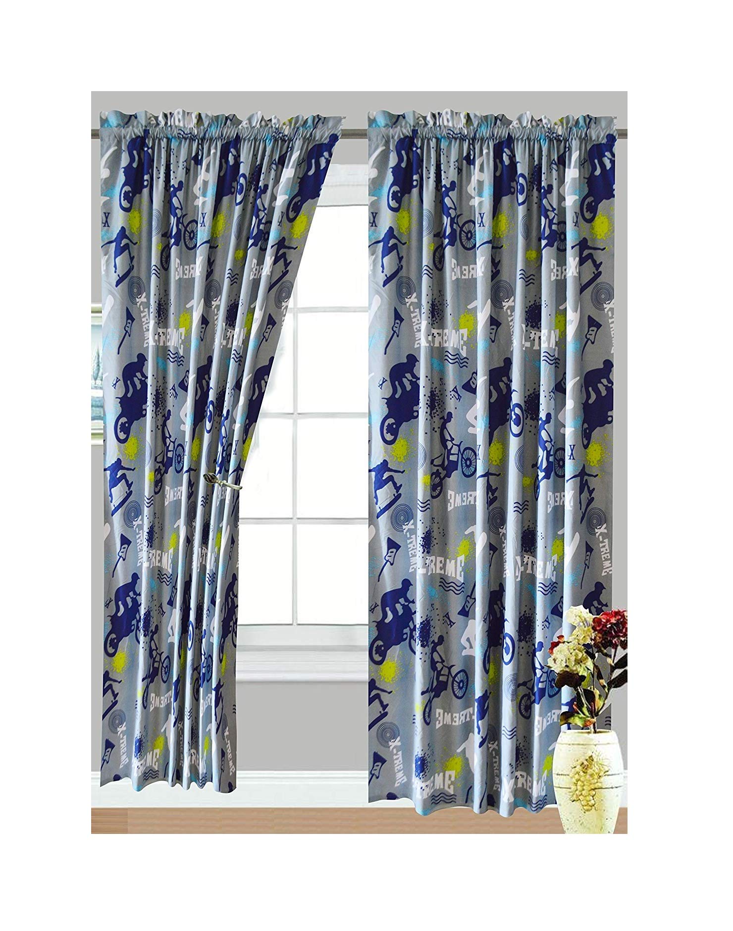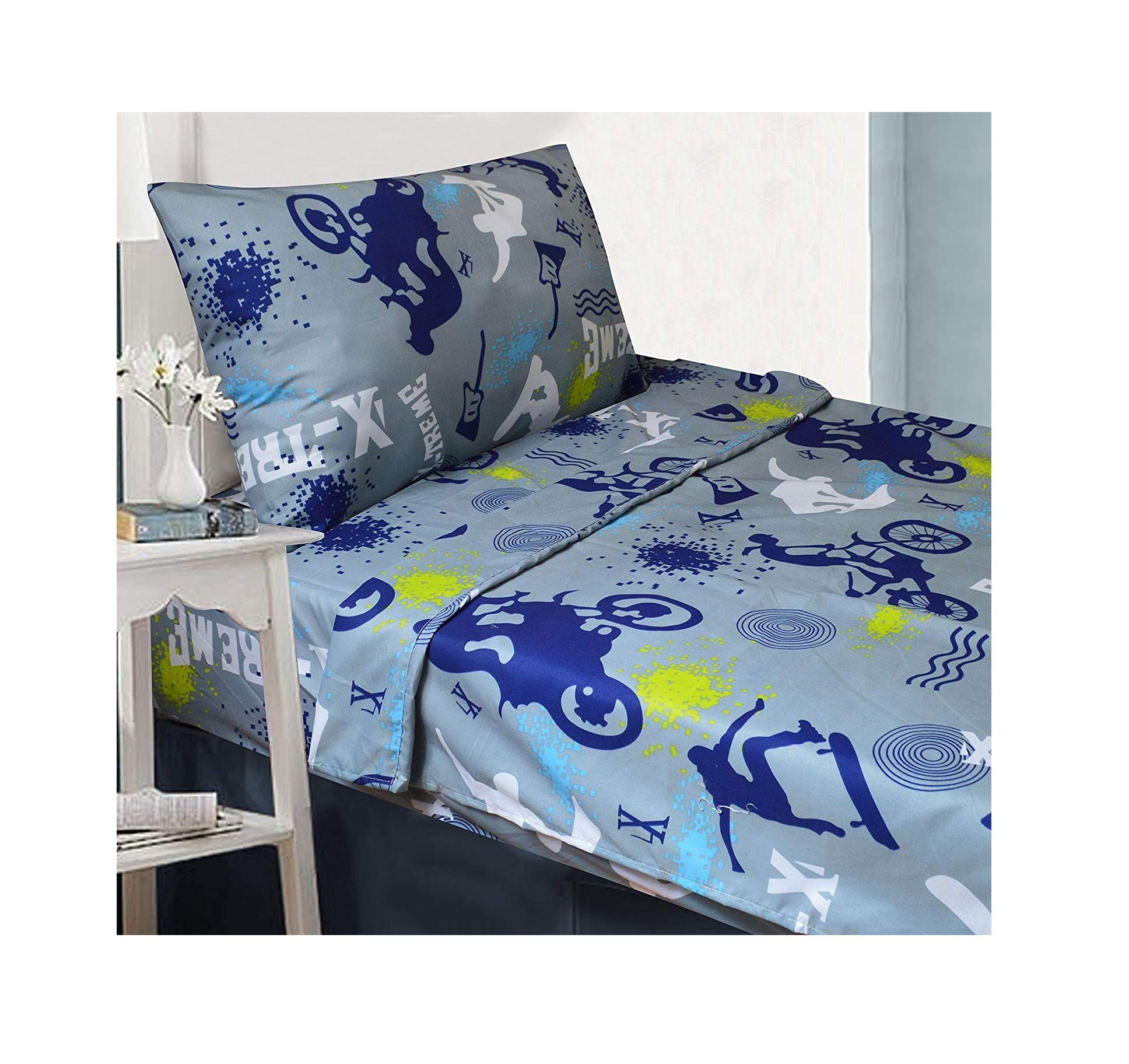 Details: The X-TremeSports comforter set is perfect for the skateboarder, mountain biker or snowboarder in your house. The silhouetted sports figures make a fun pattern on one side of the comforter, while the reverse is a soothing solid color. The twin comforter comes with one matching pillow sham for a full bed set in one easy package. Rounding out the set is an accent pillow featuring a skateboarder to complete the look. Polyester construction is durable and machine washable. Comforter measures 76" x 86" This bedding adds a punch of pizzazz to any child's or teen's bedroom.
