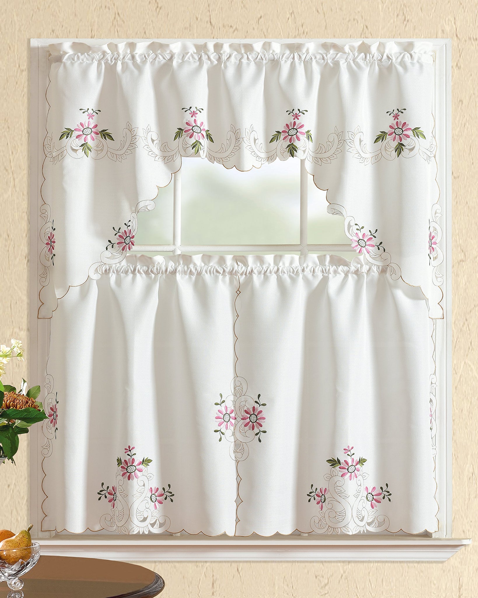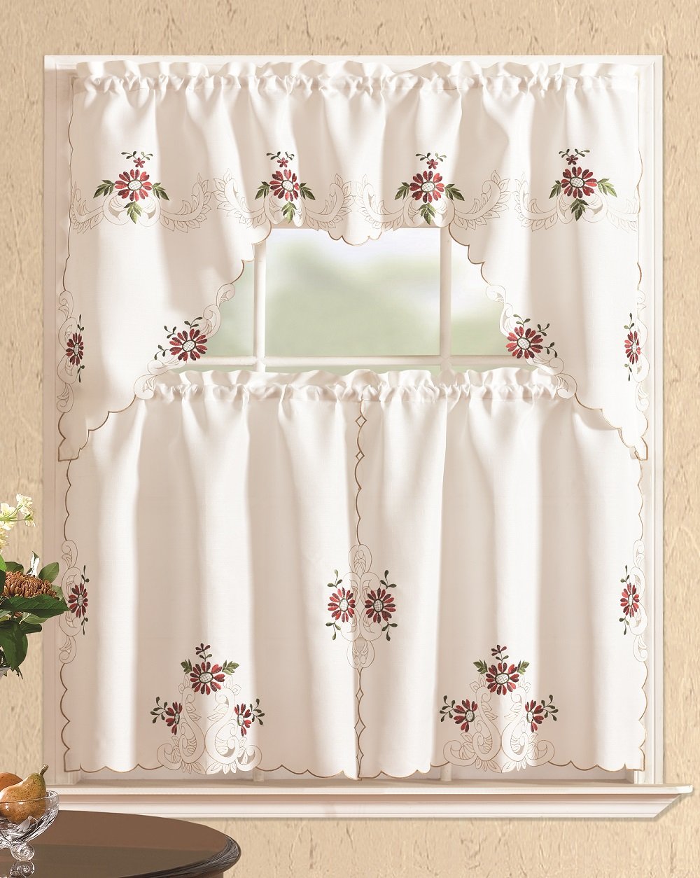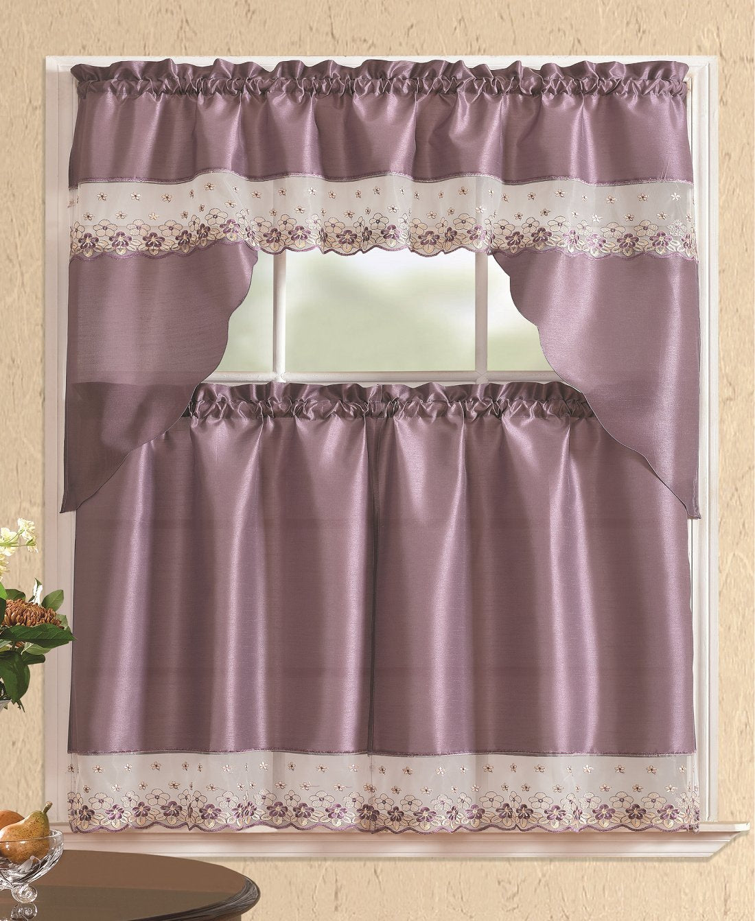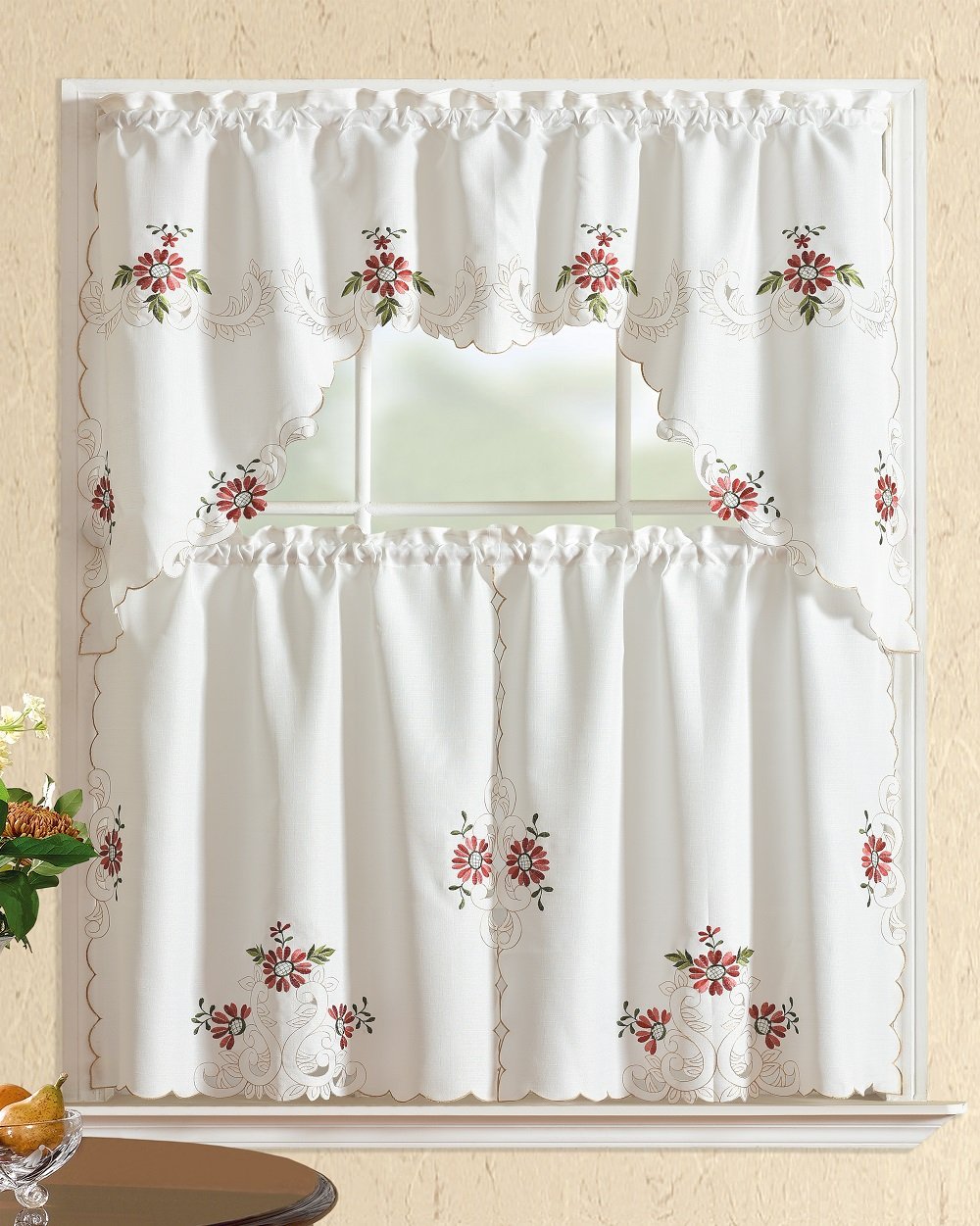 All American Collection Modern Embroidered 3pc Kitchen Curtain Set with Swag Valance