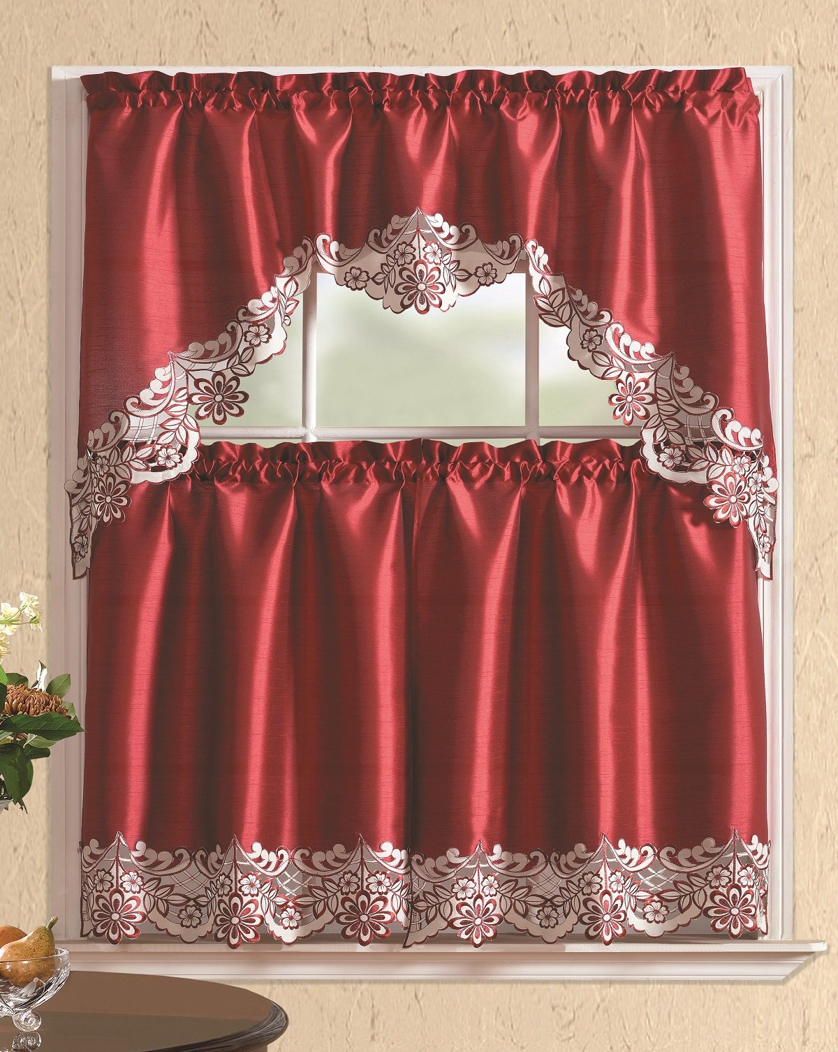 Details: This Kitchen Curtain Set is great for any home. The kitchen curtain comes with 2 tiers that measure 30" x 36" and the swag valance measures 60" x 36". The sets that come with a straight valance have 2 tiers of 30" x 36" and a valance measurement of 60" x 14".