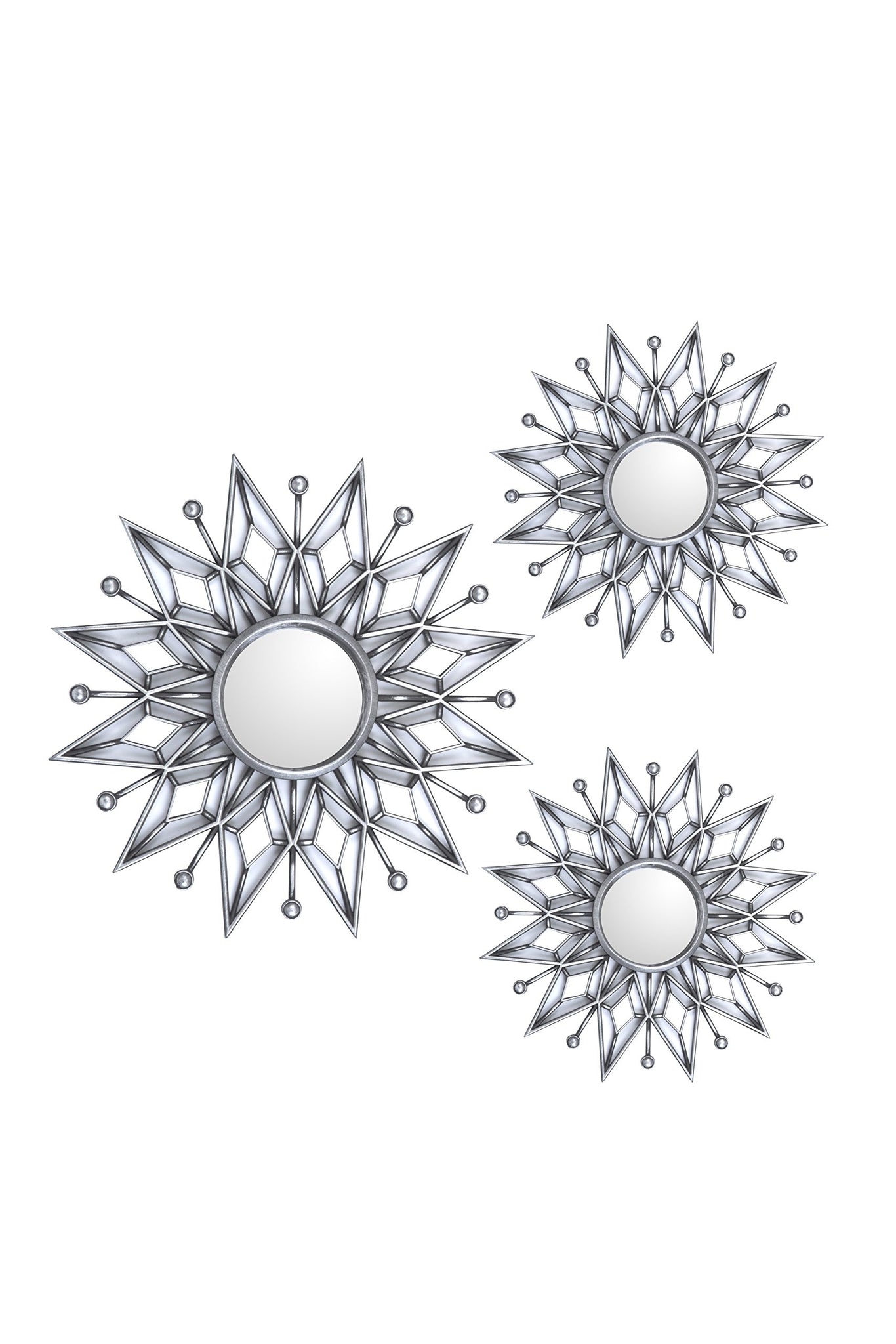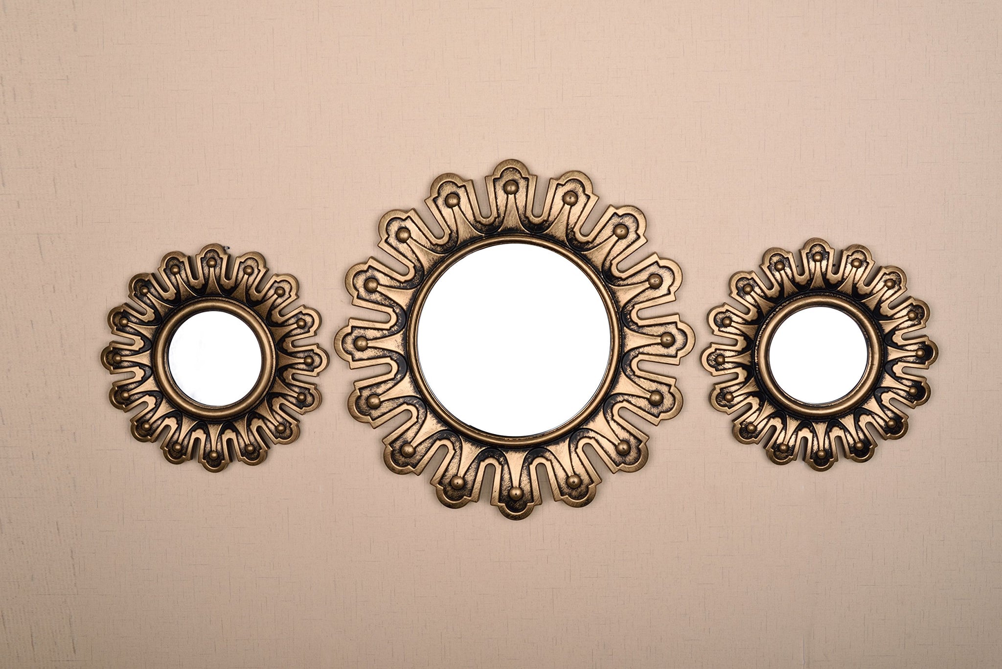 Details: Bring a flare of energy and design to your favorite space with this very beautiful 3 piece Decorative Mirror Set. Perfect to accent any wall, whether you decide to display them in the master bedroom or spice up the dining room. Wipes clean with glass cleaner and a cloth.