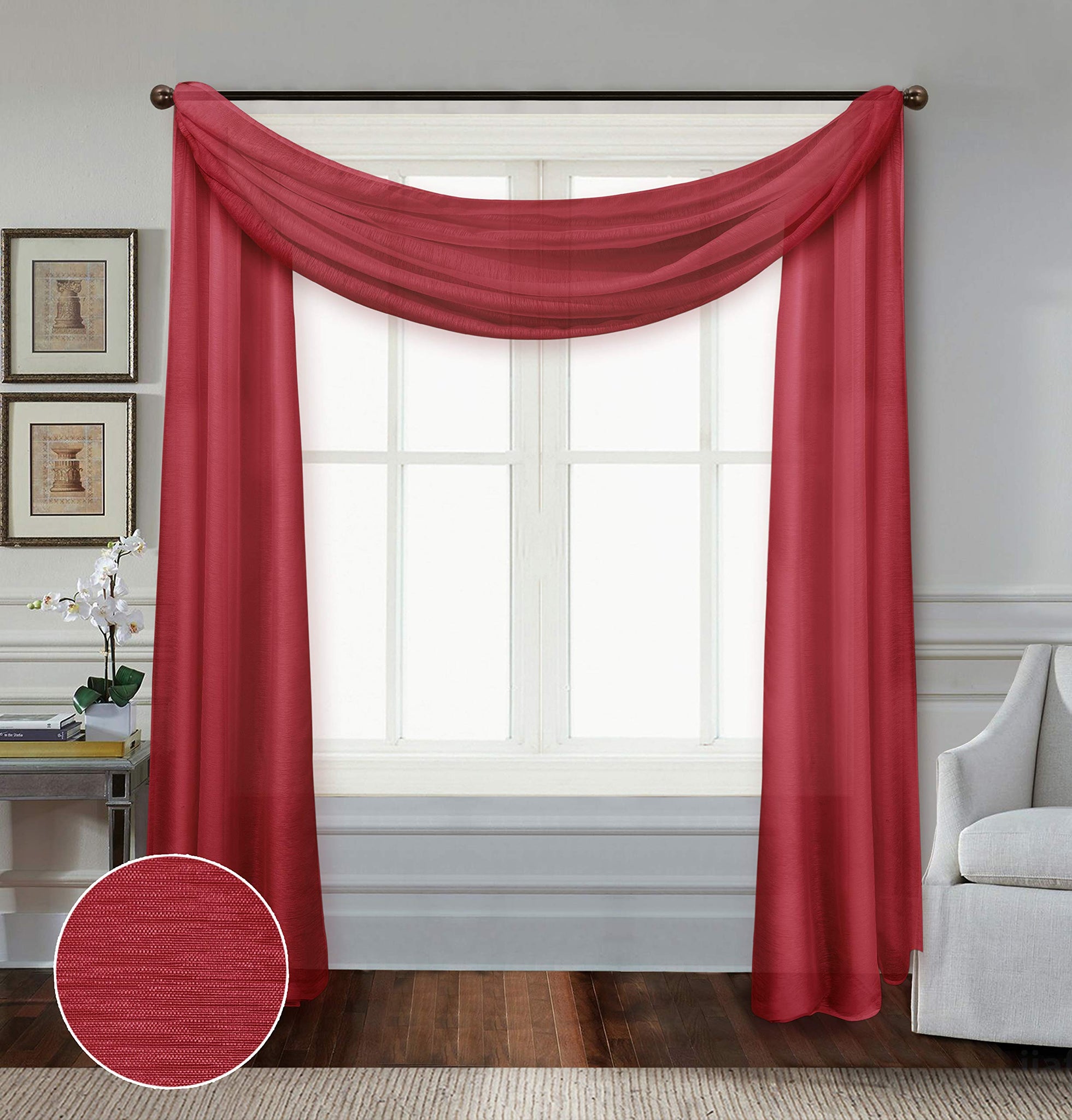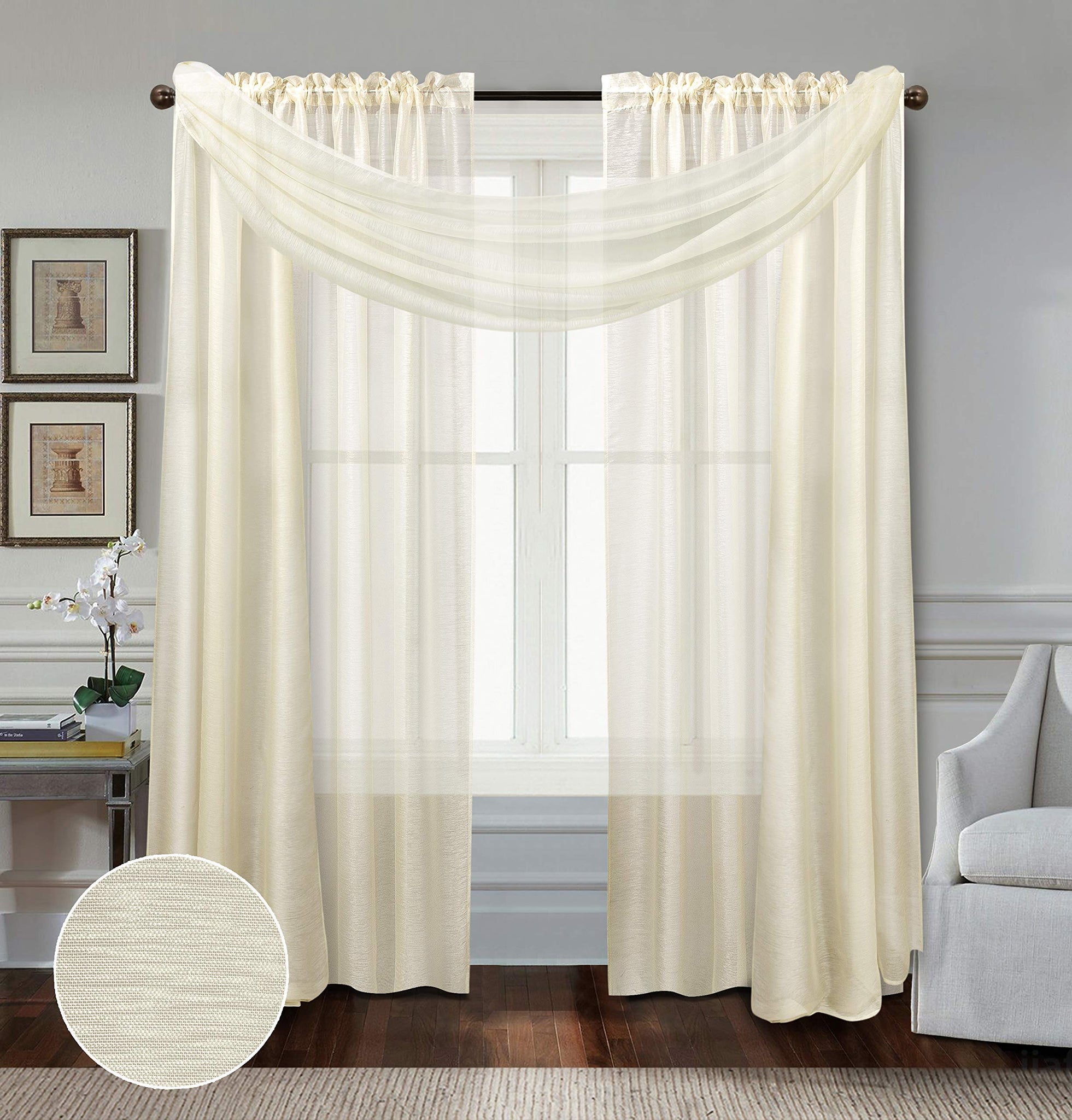 Details: Enhance your interior design with lightweight Doli sheers from the All American Collection. Each package contains two curtain panels and 1 scarf. The sheer fabric filters natural daylight through your windows while adding rich color that doesn't get washed out. The 1-inch rod pocket offers classic, carefree styling and easy installation - just hang and go!